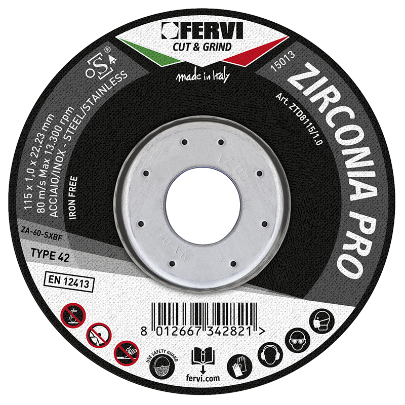 NARROW DOMED DISCS, TO MAXIMIZE THE FLAT WORKING AREA. IT ALLOWS YOU TO MAKE MORE CUTS, DEEPER THAN A DEPRESSED CENTER DISC AND THE SAME DURATION AND CUTTING CAPACITY OF A FLAT DISC WITH THE ADVANTAGE OF GREATER RIGIDITY GIVEN BY THE DEPRESSED CENTER SHAPE AND THE DOME. THE EXTREMELY THIN THICKNESS ALLOWS THE EXECUTION OF CUTS WITH MINIMAL FORMATION OF BURRS.