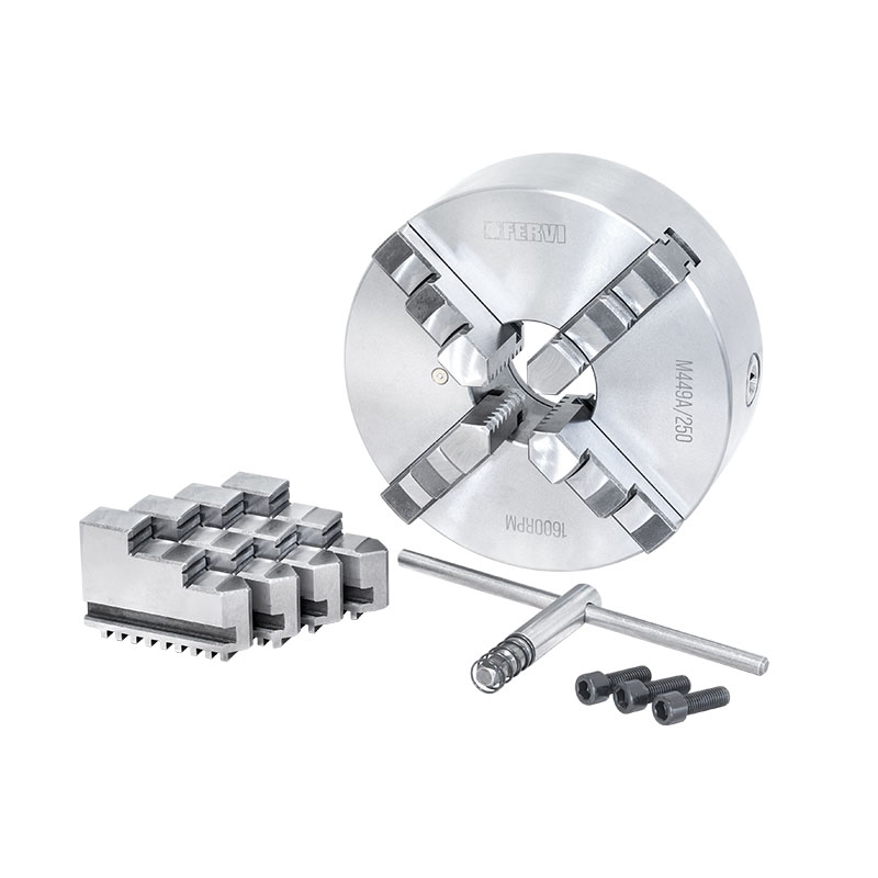 A GUIDA SINGOLA. GRIFFE INTEGRALI, SERRAGGIO CONCENTRICO, DOTATO DI 1 SERIE COMPOSTA DA 4 GRIFFE PER INTERNI, 1 SERIE COMPOSTA DA 4 GRIFFE PER ESTERNI E CHIAVE DI SERRAGGIO. COPERTURA POSTERIORE IN METALLO PER LE MISURE Ø 250 MM, Ø 300 MM E Ø 400 MM.